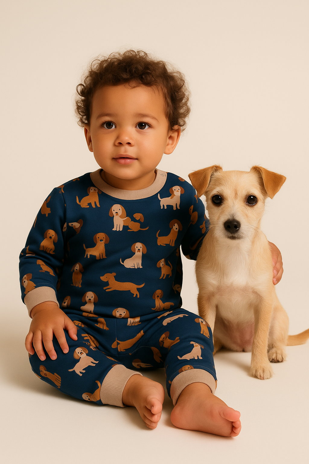Sevimli köpek deseniyle miniklere neşe katan bu lacivert erkek çocuk pijama takımı, %95 pamuk ve %5 elastan içeriğiyle yumuşacık ve esnek bir yapıya sahiptir. Cilde dost kumaşı sayesinde rahat bir uyku deneyimi sunarken, esnek yapısı çocukların hareket özgürlüğünü kısıtlamaz. Hem şirin tasarımı hem de konforuyla, gece rutinlerinin vazgeçilmezi olacak bu pijama takımı, çocuklar kadar ebeveynlerin de favorisi!